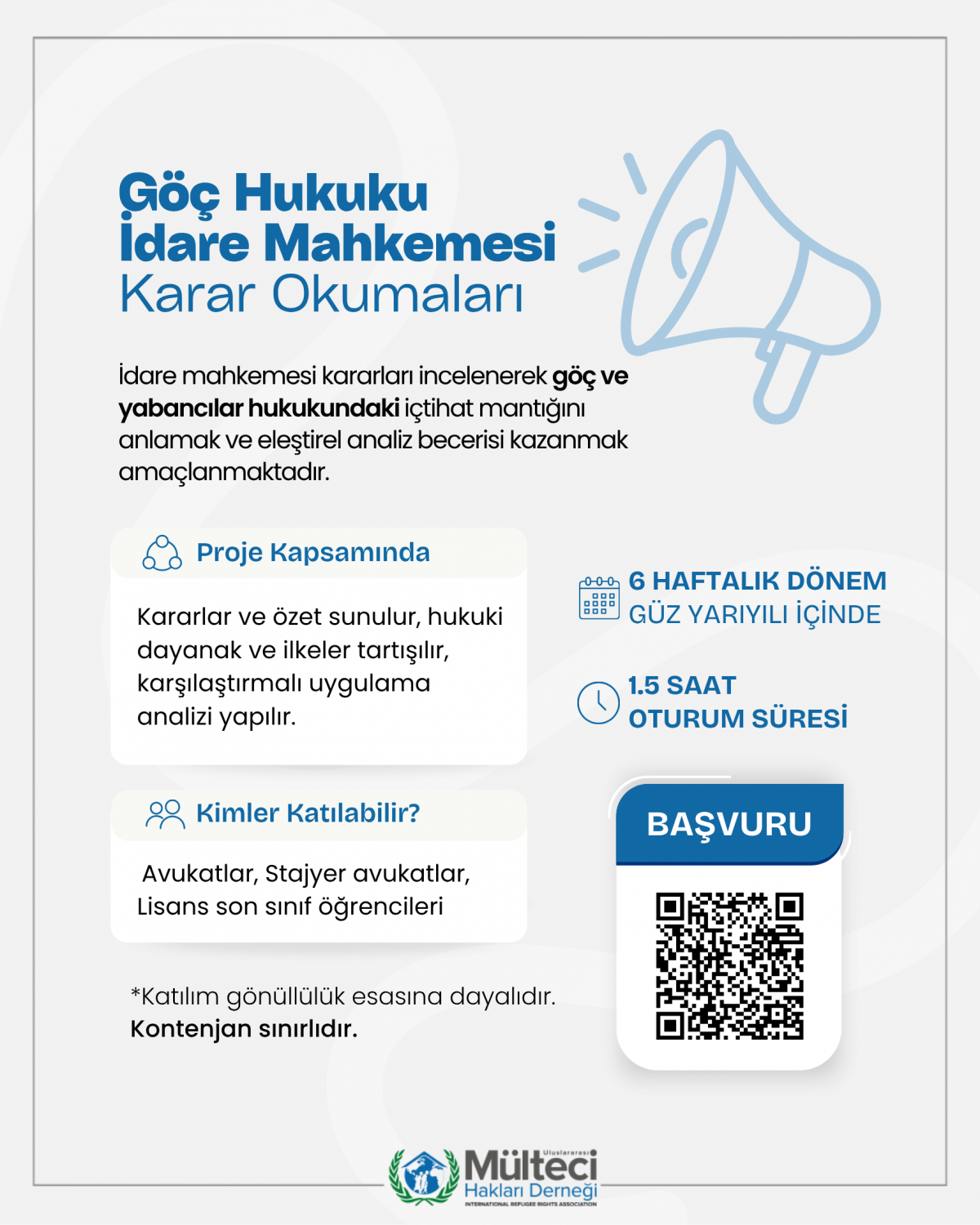 Uluslararası Mülteci Hakları Derneği, göç ve yabancılar hukuku alanında çalışan ve bu alana ilgi duyan hukukçular için yeni bir eğitim programı başlatıyor: “Göç Hukuku İdare Mahkemesi Karar Okumaları”. Program kapsamında, idare mahkemelerinin göç ve yabancılar hukukuna ilişkin verdiği kararlar incelenerek, katılımcıların içtihat mantığını daha iyi kavraması, hukuki değerlendirmeleri eleştirel bir bakış açısıyla analiz edebilmesi hedeflenmektedir.